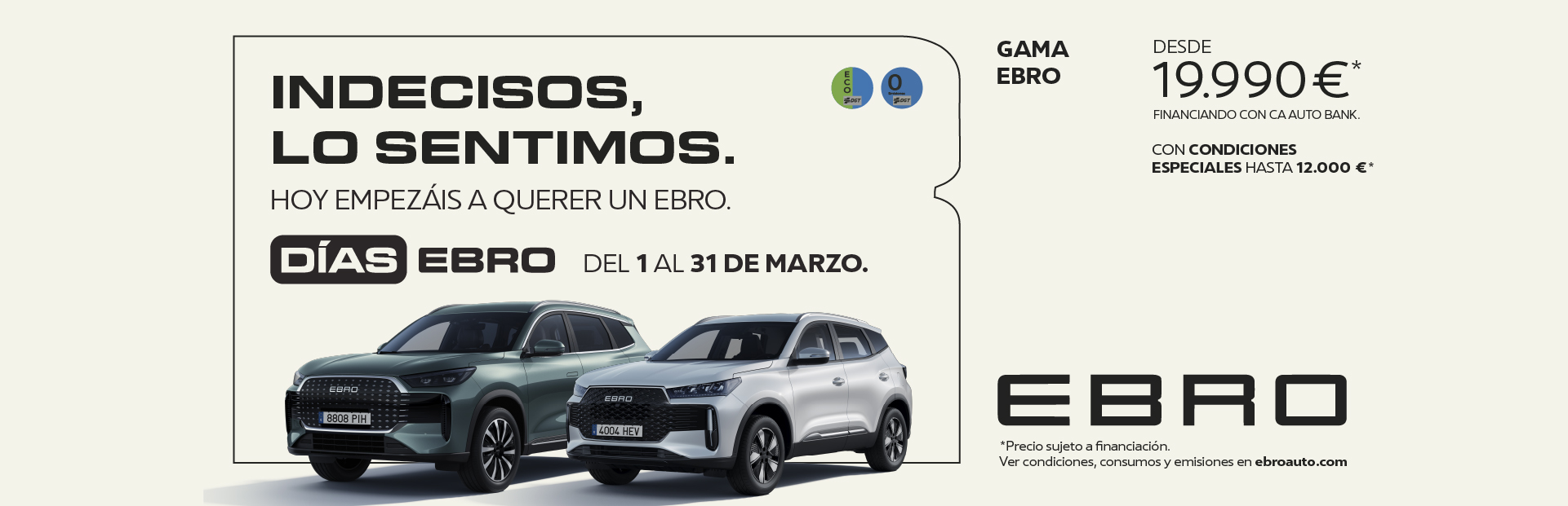 (2) EBRO s700 PHEV Premium desde PVP Recomendado Financiando: 29.990,00 €. Incluye IVA, Transporte e Impuesto de Matriculación (IEMT) calculado al tipo general, descuentos del concesionario, fabricante y descuento adicional por financiar con CA Auto Bank, Spa Sucursal en España, según condiciones contractuales por un importe mínimo a financiar de 20.000,00 € con un plazo mínimo de 60 meses y permanencia mínima de 36 meses. Incluye adelanto de 2.925€ correspondiente a la subvención estatal del Plan Auto+ (Plan España Auto 2030) por CA Auto Bank, para particulares que tengan derecho a beneficiarse; en su defecto, el cliente deberá abonar dicho importe a la entidad financiera, condicionado a la aprobación del RD-ley 02/2026 y a la disponibilidad de fondos del Ministerio de Industria y Turismo. Financiación ofrecida por CA Auto Bank, SpA Sucursal en España, según condiciones contractuales por un importe mínimo según campaña con un plazo entre 60 y 72 meses. El periodo de carencia no implica la acumulación de intereses al capital. Financiación sujeta a estudio y aprobación de la entidad financiera. PVP recomendado al contado: 35.532,20 €. Oferta válida hasta el 31/03/2026 en Península y Baleares. No acumulable a otras ofertas o descuentos especiales. El modelo visualizado puede no corresponder con el vehículo ofertado. No incluye gastos de gestoría, ni matriculación.