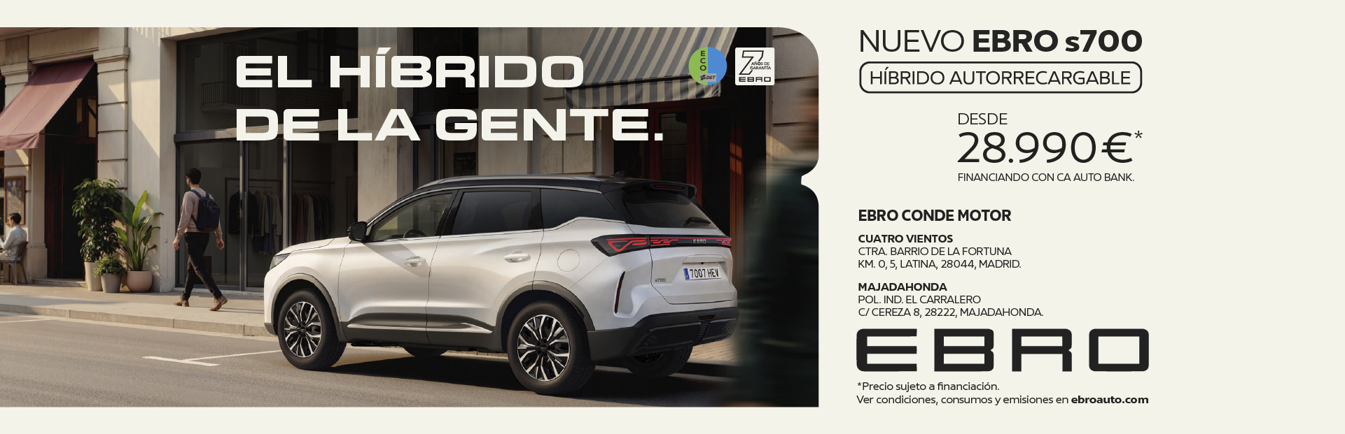 El nuevo EBRO s700 Híbrido combina eficiencia autorrecargable, tecnología avanzada y seguridad en un solo SUV. Con etiqueta ECO para que disfrutes de la movilidad sostenible.